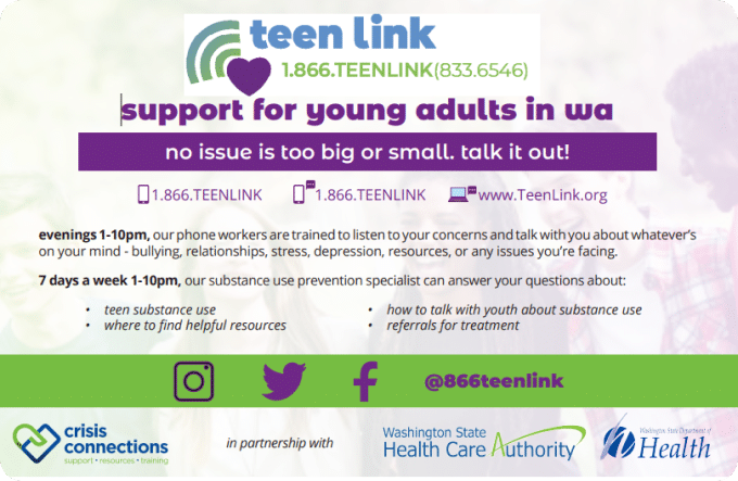 Teen Link is a program of Crisis Connections that serves youth in Washington State.